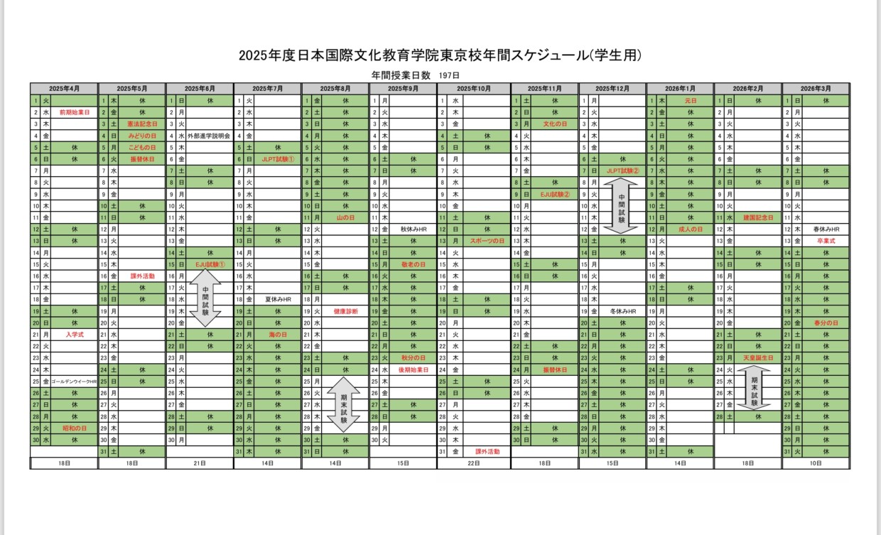 年間スケジュール 2025年度の長期休暇期間は下記のとおりとなります。 春季休暇:令和7年3月15日(土)〜令和7年4月1日(火) 夏季休暇:令和7年7月19日(土)〜令和7年8月11日(月) 秋季休暇:令和7年9月13日(土)〜令和7年9月23日(火) 冬季休暇:令和7年12月20日(土)〜令和8年1月12日(月)