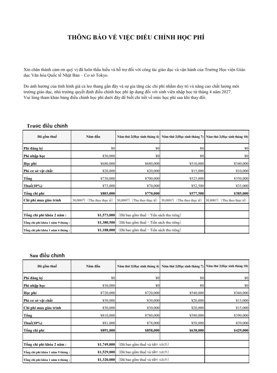 Thông báo về việc điều chỉnh học phí 2026/03/06 Kể từ tháng 4 năm 2027 học viện sẽ điều chỉnh học phí. Thông tin chi tiết xin vui lòng tham khảo bên dưới